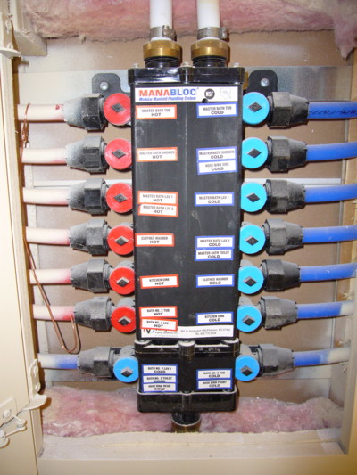 view of a PEX plumbing manifold more common in newer homes.